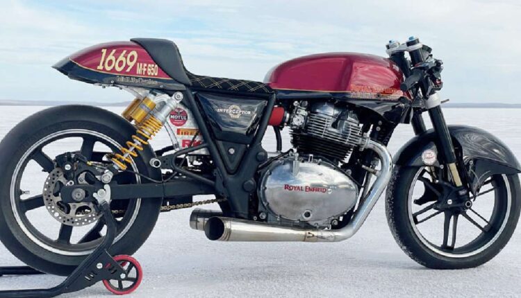 Mid Life Cycles Royal Enfield Interceptor 650 salt racer could have been a simple Interceptor that would have spent its life pottering around and fulfilling the daily needs of its rider. Rather, it was stripped and put through a series of changes to achieve a new High Speed Dragster that could achieve a speed record. The Interceptor in question was able to break the four year old class record on each of its runs, leaving the new mark at 132.050 MPH which translates to 212.514 Km/h