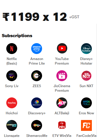 Under this Rs 1199 comes Netflix (Basic), Amazon Prime Lite, YouTube Premium, Disney+ Hotstar, SonyLIV, ZEE5, JioCinema Premium, SunNXT, Hoichoi, Discovery+, ALTBalaji, Eros Now, ShemarooMe, LionsgatePlay, ETVWin, and FanCode .