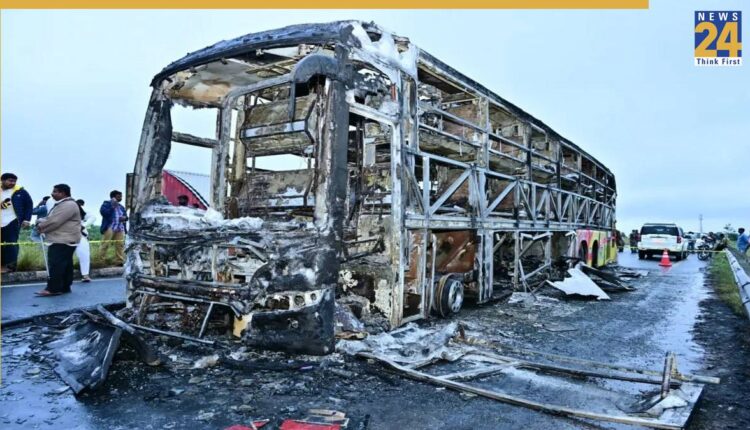 The private sleeper bus caught fire after hitting the motorbike, which was lying on the road in the early hours of the day. Shiva Shankar of Kurnool reportedly lost control of the two-wheeler, which then hit a divider. A while later, the bus collided with the motorbike and caught fire, according to police.