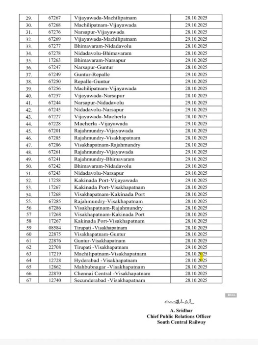South Central Railway has cancelled several trains scheduled for 28 and 29 October 2025. The cancellations include services on key routes such as,