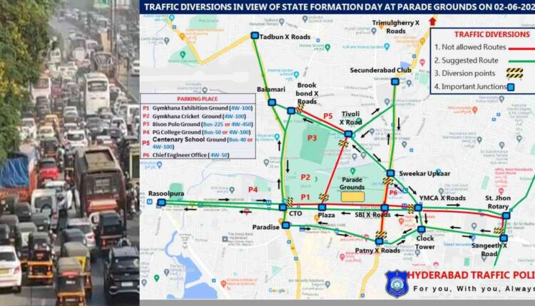 Commuters are urged to note the #TrafficAdvisory in view of Telangana State Formation Day celebrations at Gun Park, Nampally and #ParadeGrounds Sec-bad on 02-06-2025 from 6:00 AM to 1:00 PM.#TelanganaFormationDay #TrafficRestrictions pic.twitter.com/8ZhEiZURtK— Hyderabad Traffic Police (@HYDTP) June 1, 2025