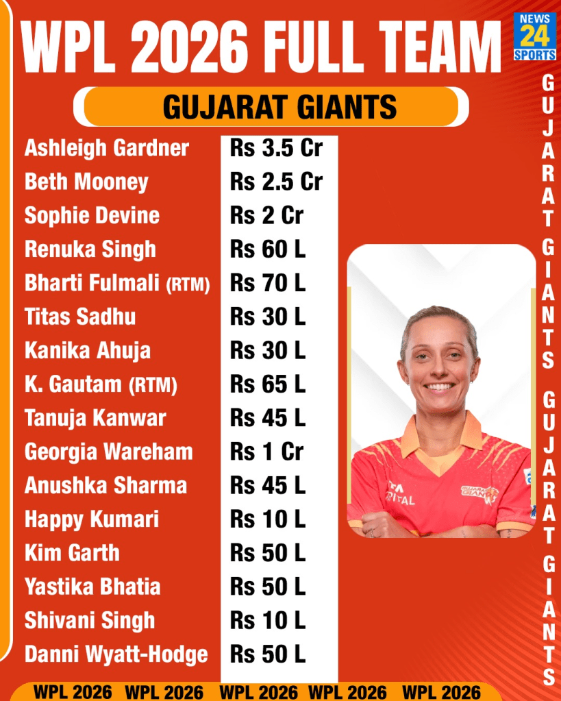 Full Squad: Bharti Fulmali (RTM, INR 70 lakh), Danni Wyatt-Hodge (INR 50 lakh), Shivani Singh (INR 10 lakh), Beth Mooney (retained INR 2.5 crore), Yastika Bhatia (INR 50 lakh), Ashleigh Gardner (retained, INR 3.50 crore), Sophie Devine (INR 2 crore), Georgia Wareham (INR 1 crore), Kashvee Gautam (RTM, INR 65 lakh), Anushka Sharma (INR 45 lakh), Kanika Ahuja (INR 30 lakh), Ayushi Soni (INR 30 lakh), Tanuja Kanwar (INR 45 lakh), Rajeshwari Gayakwad (INR 40 lakh), Renuka Singh (INR 60 lakh), Kim Garth (INR 50 lakh), Titas Sadhu (INR 30 lakh), Happy Kumari (INR 10 lakh).