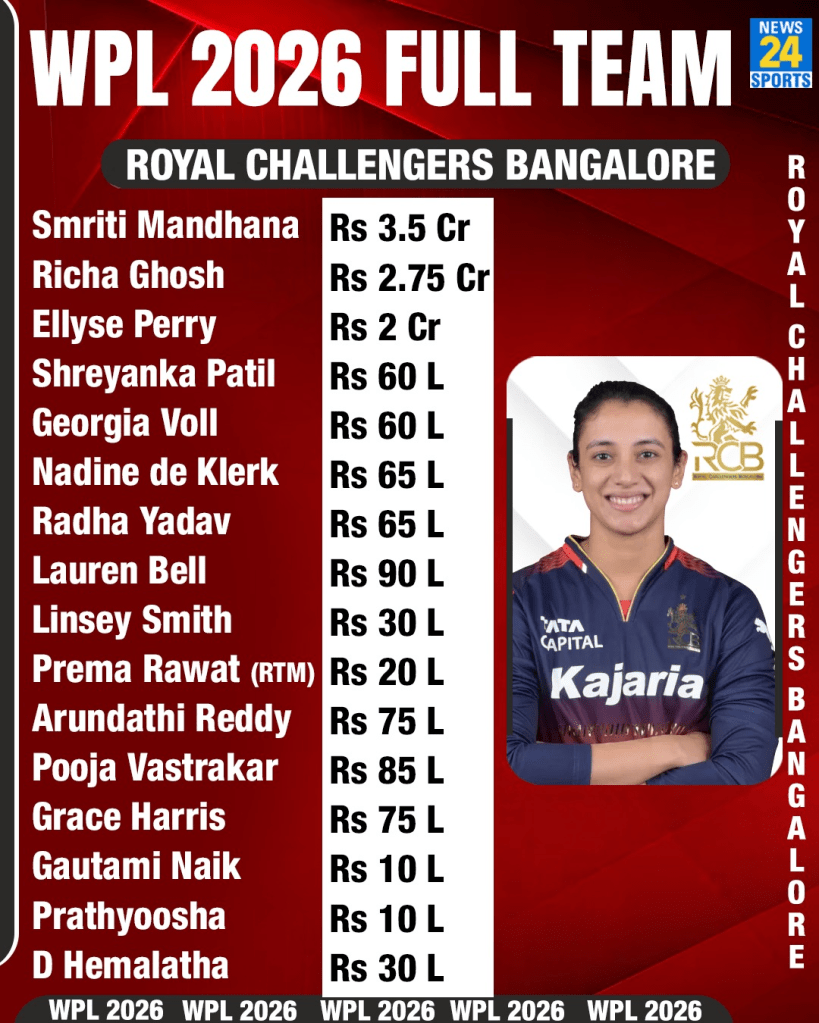 Full Squad: Smriti Mandhana (INR 3.5 crore), Georgia Voll (INR 60 lakh), D Hemalatha (INR 30 lakh), Gautami Naik (INR 10 lakh), Richa Ghosh (INR 2.75 crore), Pratyoosha Kumar (INR 10 lakh), Ellyse Perry (INR 2 crore), Pooja Vastrakar (INR 85 lakh), Grace Harris (INR 75 lakh), Nadine de Klerk (INR 60 lakh), Shreyanka Patil (INR 60 lakh), Radha Yadav (INR 65 lakh), Linsey Smith (INR 30 lakh), Prema Rawat (RTM, INR 20 lakh), Arundhati Reddy (INR 75 lakh), Lauren Bell (INR 90 lakh).
