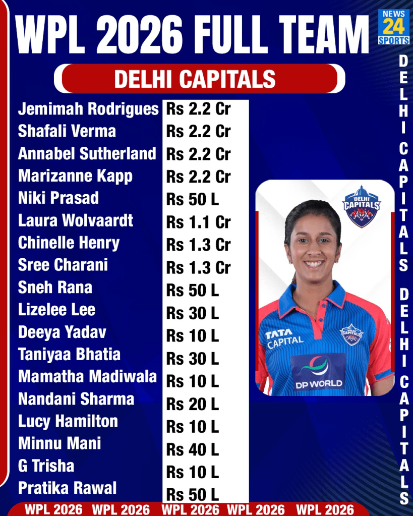 Full Squad: Shafali Verma (INR 2.20 crore), Jemimah Rodrigues (INR 2.20 crore), Laura Wolvaardt (INR 1.10 crore), Deeya Yadav (INR 10 lakh), Taniya Bhatia (INR 30 lakh), Lizelle Lee (INR 30 lakh), Mamatha Madiwala (INR 10 lakh), Annabel Sutherland (INR 2.20 crore), Marizanne Kapp (INR 2.20 crore), Niki Prasad (INR 50 lakh), Chinelle Henry (INR 1.30 crore), Sneh Rana (INR 50 lakh), Minnu Mani (INR 40 lakh), Lucy Hamilton (INR 10 lakh), Shree Charani (INR 1.30 crore), Nandani Sharma (INR 20 lakh).