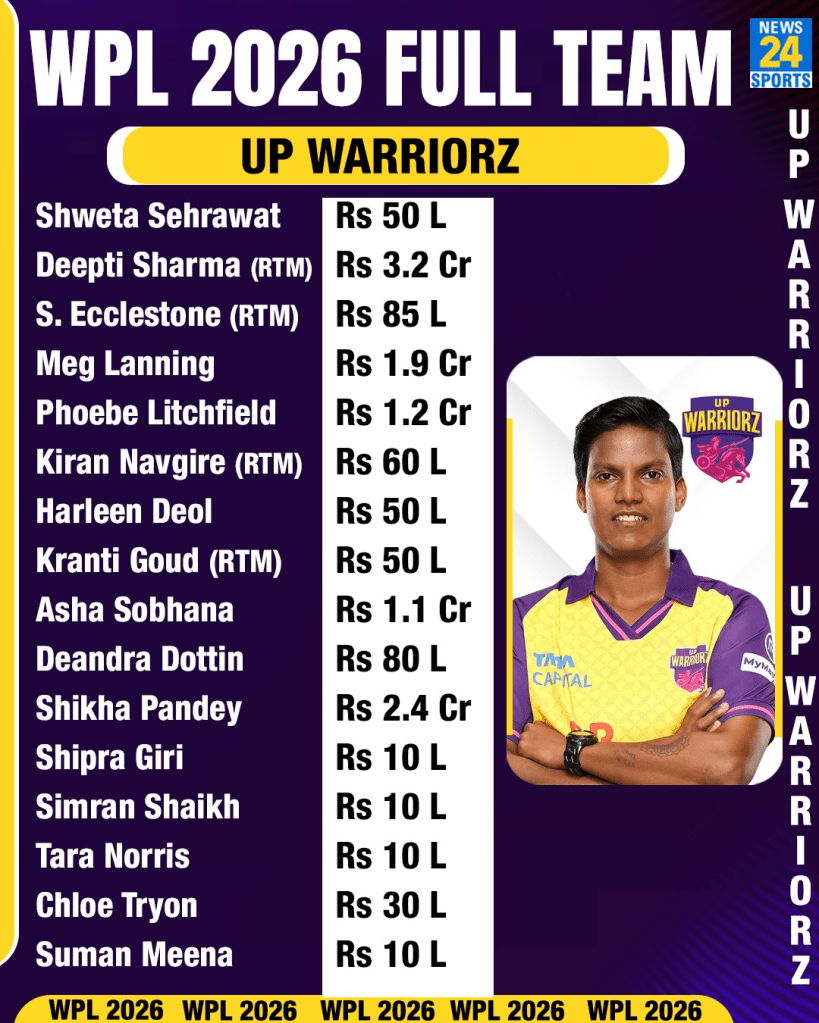 Full Squad: Meg Lanning (INR 1.90 crore), Phoebe Litchfield (INR 1.20 crore), Kiran Navgire (RTM, INR 60 lakh), Pratika Rawal (INR 50 lakh), Shweta Sehrawat (retained, INR 50 lakh), Harleen Deol (INR 50 lakh), Simran Shaikh (INR 10 lakh), Shipra Giri (INR 10 lakh), Deepti Sharma (RTM, INR 3.20 crore), Deandra Dottin (INR 0.80 crore), Chloe Tryon (INR 30 lakh), G Trisha (INR 10 lakh), Suman Meena (INR 10 lakh), Asha Sobhana (INR 1.1 crore), Sophie Ecclestone (RTM, INR 0.85 crore), Shikha Pandey (INR 2.40 crore), Kranti Gaud (RTM, INR 50 lakh), Tara Norris (INR 10 lakh).
